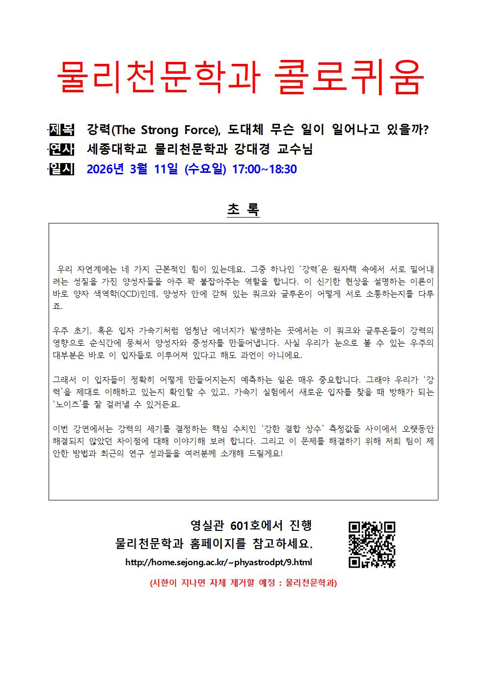 [콜로퀴움] 강력(The Strong Force), 도대체 무슨 일이 일어나고 있을까?(세종대학교 물리천문학과 강대경 교수님)