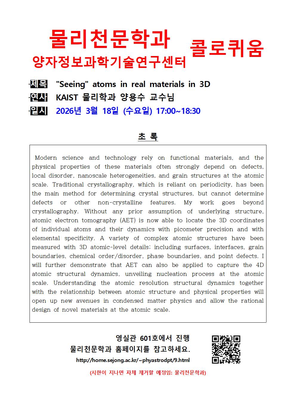 [콜로퀴움] 3차원으로 들여다보는 원자들의 세계(KAIST 물리학과 양용수 교수님)