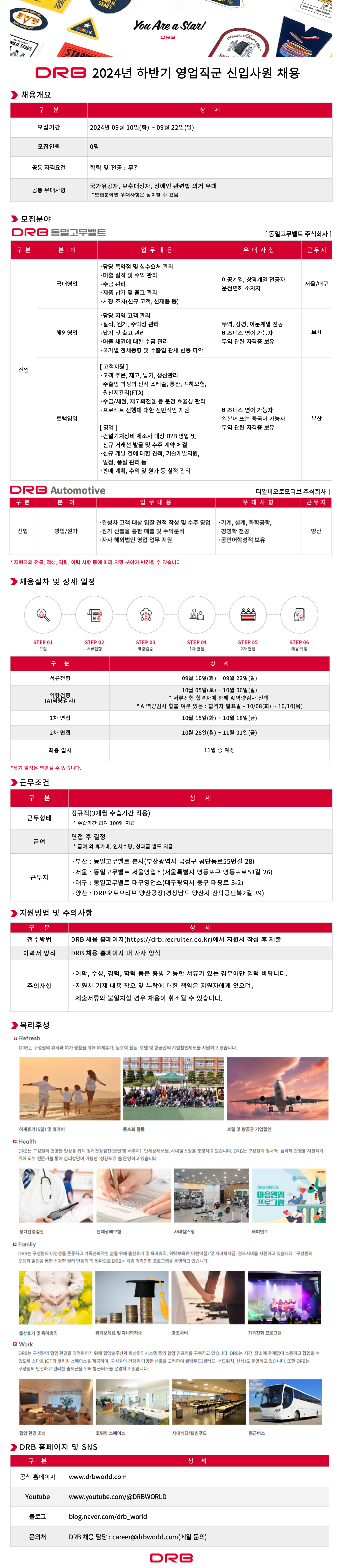 DRB 2024년 하반기 영업직군 신입사원 채용 공고